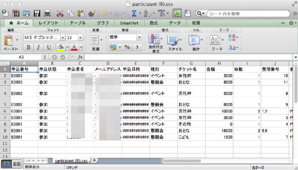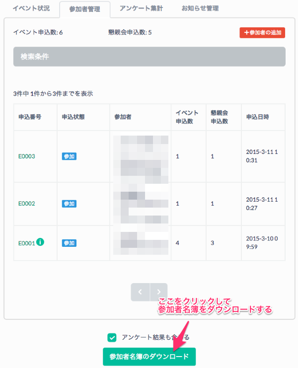 参加者管理ページの下に表示されている「参加者名簿のダウンロード」ボタンをクリックすると、CSV形式でダウンロードすることができます。