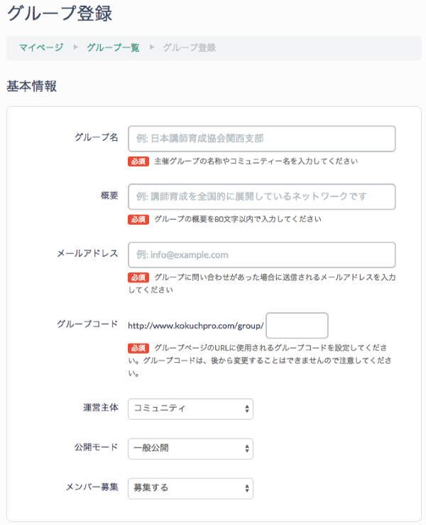 グループの新規登録ページにアクセスして、下記の必要事項を記入するとグループが登録できます。
