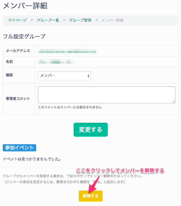 メンバーの解除 こくちーずプロ サポートセンター 2024年08月24日 00:14 更新 メンバーになっている人が、グループページにアクセス して「参加をやめる」ボタンをクリックすると解除することができます。 また、管理者がメンバーを解除することもできます。 メンバー管理ページで、メンバーの詳細を開き、「解除する」ボタンをクリックします。 メンバーの参加を拒否するには、解除を行わずにメンバーの除名を行ってください。 関連記事 グループを退会する アカウントの削除 メンバーを除名する メンバーの詳細を確認する メンバーをスタッフにする