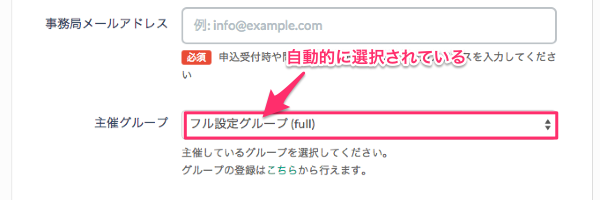 この手順で新規登録ページを開くと、イベント事務局の主催グループにはグループが設定された状態になります。