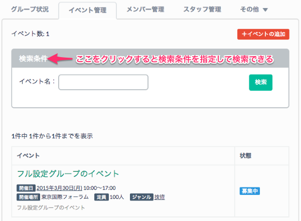 グループのイベント一覧 こくちーずプロ サポートセンター 2024年08月24日 00:41 更新 グループの管理ページで、イベント管理を選びます。 グループに割り当てられたイベントの一覧が表示されます。 検索条件をクリックして、イベント名でイベントを検索することもできます。 関連記事 グループのイベント解除 グループのイベント追加 カレンダーでイベントを探す グループのメンバーのみが申し込めるイベント グループの新規登録