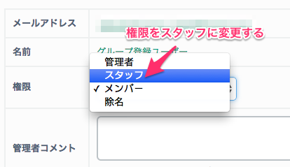 メンバーをスタッフにする こくちーずプロ サポートセンター 2024年08月23日 20:39 更新 メンバー詳細を開き、権限を「スタッフ」にして変更すると、メンバーをスタッフにすることができます。 スタッフになると、グループの管理操作が行えるようになります。 また、グループが主催しているイベントの管理も行えるようになります。 関連記事 メンバーとスタッフの違いは? グループの管理 メンバーの詳細を確認する イベントの管理 メンバーの追加