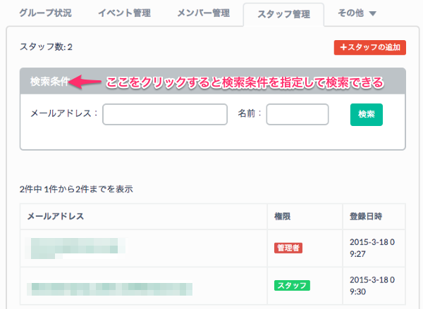 スタッフの一覧 こくちーずプロ サポートセンター 2024年08月24日 00:14 更新 グループの管理ページで、スタッフ管理を選びます。 グループのスタッフ一覧が表示されます。 検索条件をクリックして、名前、メールアドレスでスタッフを検索することもできます。 関連記事 スタッフの詳細を確認する スタッフを管理者にする メンバーをスタッフにする メールが不達の参加者を検索する イベントまとめの新規登録