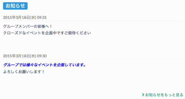 登録したお知らせは、グループページとグループメンバーのマイページに表示されます。