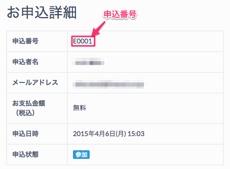 申込番号は、イベントの申込毎に発行されるEから始まる番号です。