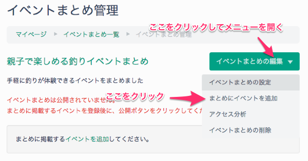 イベントまとめの管理ページで、「まとめにイベントを追加」を選びます。