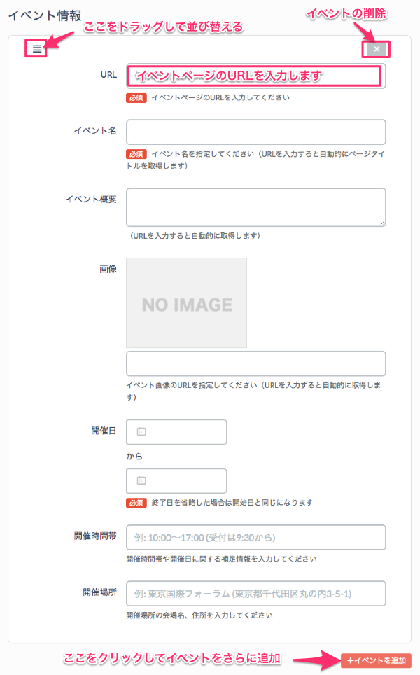 イベントのURLを入力して、イベント名の入力ボックスにフォーカスを移動させると自動的に、イベント名、イベント概要、画像URLが取得します。(URLによっては自動取得できないケースがあります)