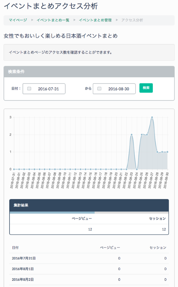前日までにイベントまとめページにアクセスされたページビュー数とセッション数を確認することができます。
