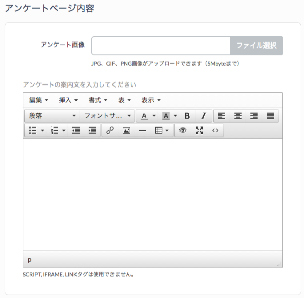 | 案内文 | アンケートページに表示する案内文を入力してください。 (HTMLタグを利用することも可能ですが、一部のタグはご利用いただけません) |
