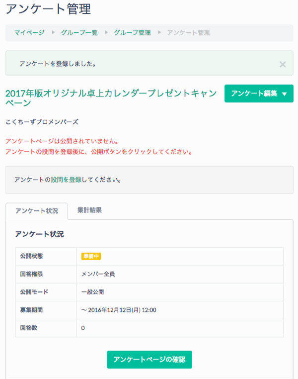 必要事項を記入した後に、「登録する」ボタンをクリックすると、アンケートが登録されます。