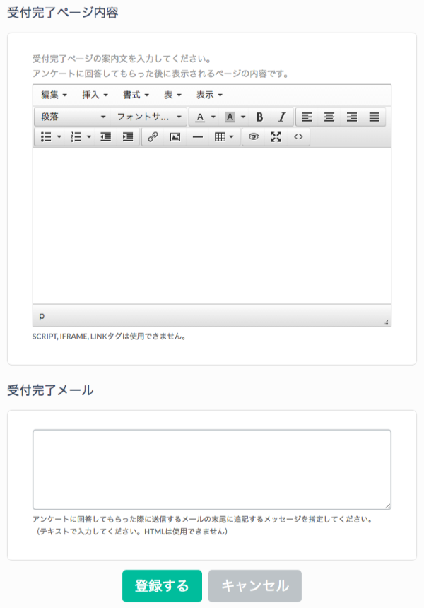 | 受付完了ページ内容 | 受付完了ページに表示する案内文を入力してください。 (HTMLタグを利用することも可能ですが、一部のタグはご利用いただけません) |
