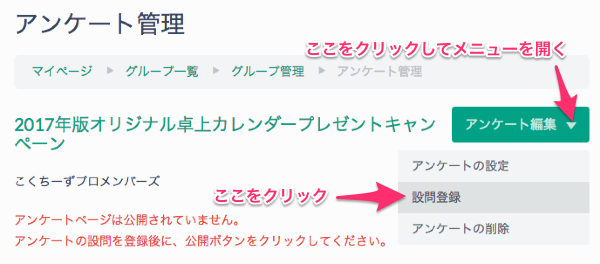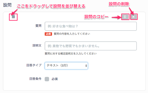 ただし、アンケート公開後には設問の削除と並び替えはできませんのでご注意ください。