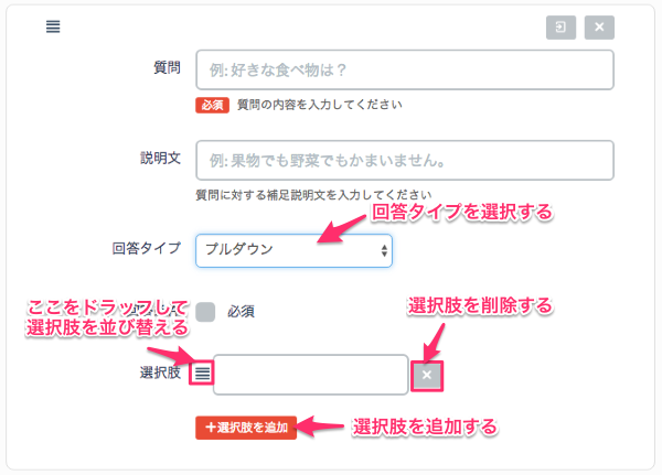 複数の選択肢から選ぶ場合は、プルダウンとチェックボックスを使用します。